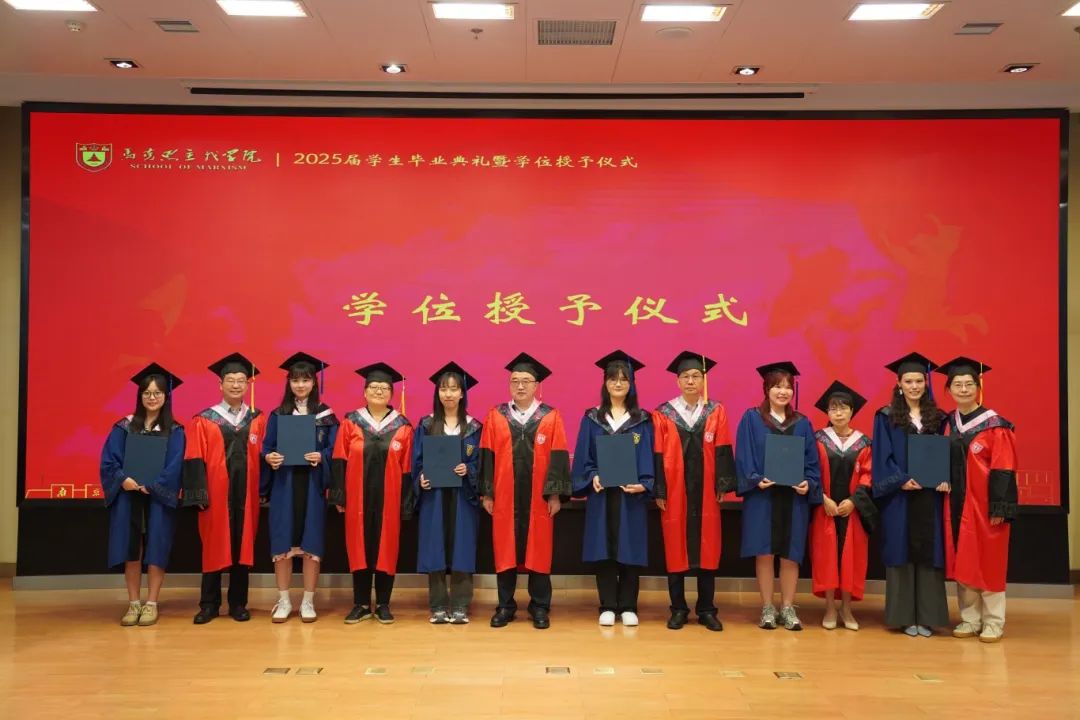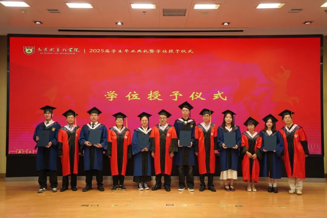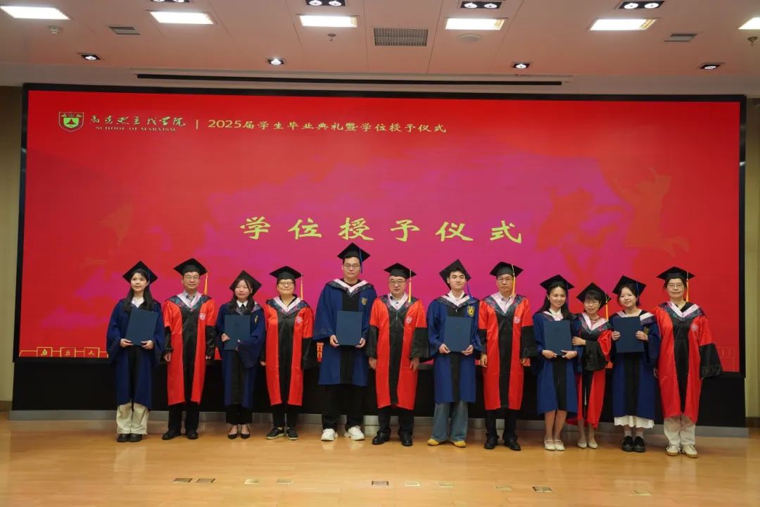 马克思主义学院2025届学生毕业典礼暨学位授予仪式在杜厦图书馆报告厅成功举办。学院党委书记时昱老师、院长王建华老师,副院长吴翠丽老师、倪春纳老师、李乾坤老师,学院学位评定分委员会委员王明生老师、戴雪红老师、熊秋良老师、暴庆刚老师,青年教师代表王楠老师、周瑞瑞老师,辅导员刘晶月老师出席典礼。典礼由学院党委副书记夏娟老师主持。