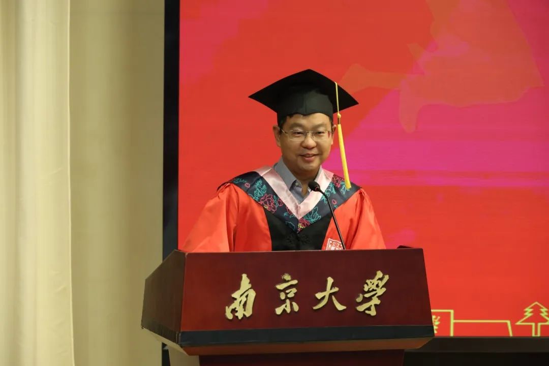 博士毕业生代表范佛山同学则用“感想”“感谢”“感悟”三个关键词,回顾了七年南大时光。在谈及感想时,他回忆了可敬师长的托举、可喜的学院发展与可爱的南马学子;在表达感谢时,他感谢恩师王建华教授的学业指导与生活关怀,感谢同窗陪伴与家人支持。最后,范佛山分享自己的感悟。他认为,立志当立长志,并终其一生为之奋斗;在前行的道路上,既要以“静”积蓄力量,也要以“争”争取价值;而面对离别,则应将不舍化作动力,以进步酬报这段难忘的时光。