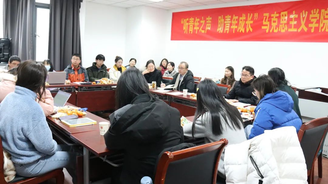 师生代表欢聚一堂,举办以“听青年之声、助青年成长”为主题的师生座谈会。学院党委书记王建华老师、院长胡大平老师、副院长陈建老师、党委副书记时昱老师、团委书记刘晶月老师以及来自