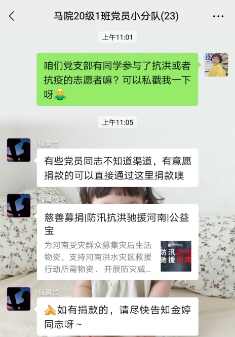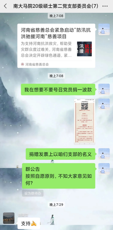 2020级研究生第二党支部全体党员很是牵挂同胞们的安危并自发组织捐款,截至目前,该党支部23位学生党员共捐款2451元,并通过二维码转账,把捐款转给河南省慈善总会。大家希望河南可以早日战胜洪水,让河南同胞们恢复正常生产生活!
