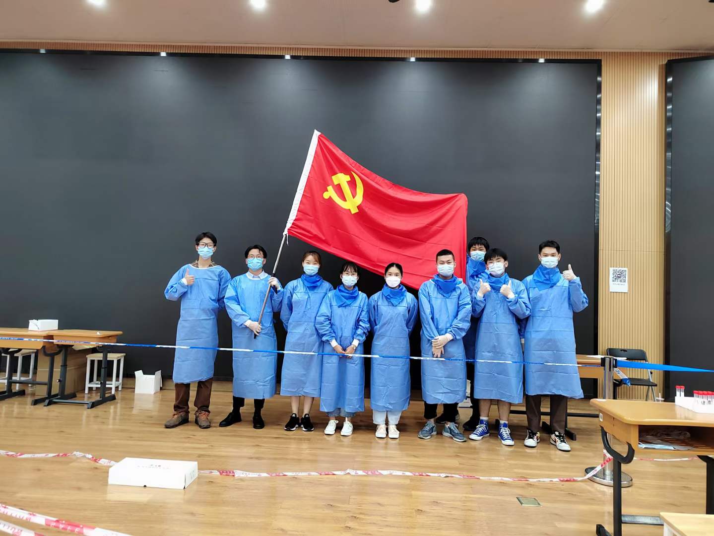 叶灿在检测点负责收集检测样本、计数、存放也为南大马院志愿者队伍提供后勤服务工作。在这次的南京战“疫”中,她和医务人员和社区工作者并肩作战,更加深刻地感受到了他们的辛苦,由衷地向奋战在一线的医务工作者、社区工作者致敬。“关键时刻,我们马院青年党员要站出来、顶上去,去防疫一线贡献出自己微薄的力量。南京需要我,时刻准备着 !”这是叶灿发出的铿锵有力的声音。蒋璐说:“作为一名青年预备党员,有责任和义务为社会做出贡献,希望能尽自己的绵薄之力与一线防疫工作人员共同守护美丽南京。” 在协同医生进行核酸检测的工作过程中,现场有秩序、有合作、有温暖,她也深感一线防疫医护人员工作的不易,此次志愿活动也让她看到了全市上下齐心协力、共克时艰的情景。石永程也作为志愿者奔赴在防疫一线,他在朋友圈里写下这样一段话“‘宁’聚人心,全民检测。让党旗在检测一线高高飘扬!”
