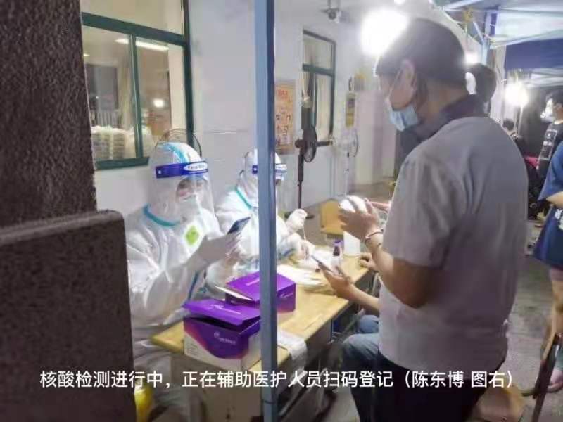 陈东博在检测点工作期间,遇到很多老人和孩子,天气炎热,酷暑难耐,婴儿在检测点排队等候期间难免哭闹,陈东博和同伴们经常对着小朋友们说“宝宝好棒!”,耐心地安抚小朋友们的情绪。很多老年人90多岁高龄,坐在轮椅上被家人推进来,老人家没有智能手机扫码登记,他们也细心地帮助老人登记信息,老人们多半听力不好,陈东博和同伴们要透过面罩十分大声和老人们沟通交流。一天的工作下来,摘掉面罩,志愿者们脸颊的勒痕清晰可见,脱掉防护服,汗水早已湿透他们衣背,他们也已经形成了大声说话的习惯,志愿者们之间说话都觉得还要大声吆喝。