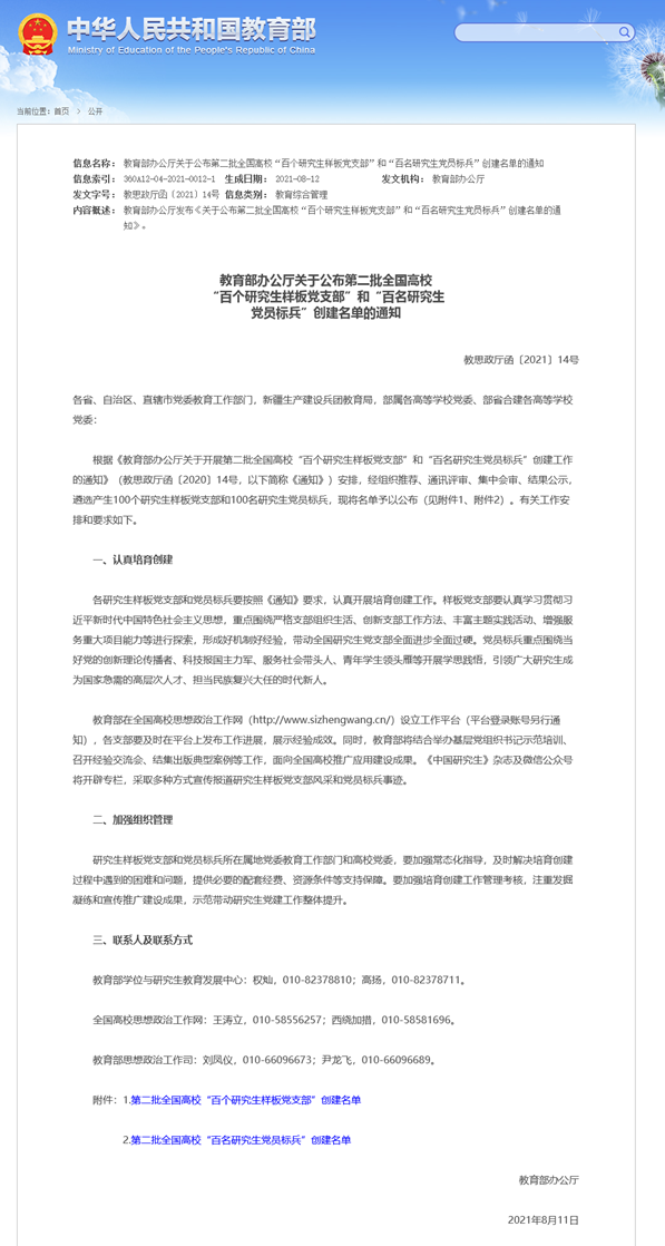 近日,教育部第二批全国高校“百个研究生样板党支部”和“百名研究生党员标兵”创建工作评审结果揭晓,可达鸭