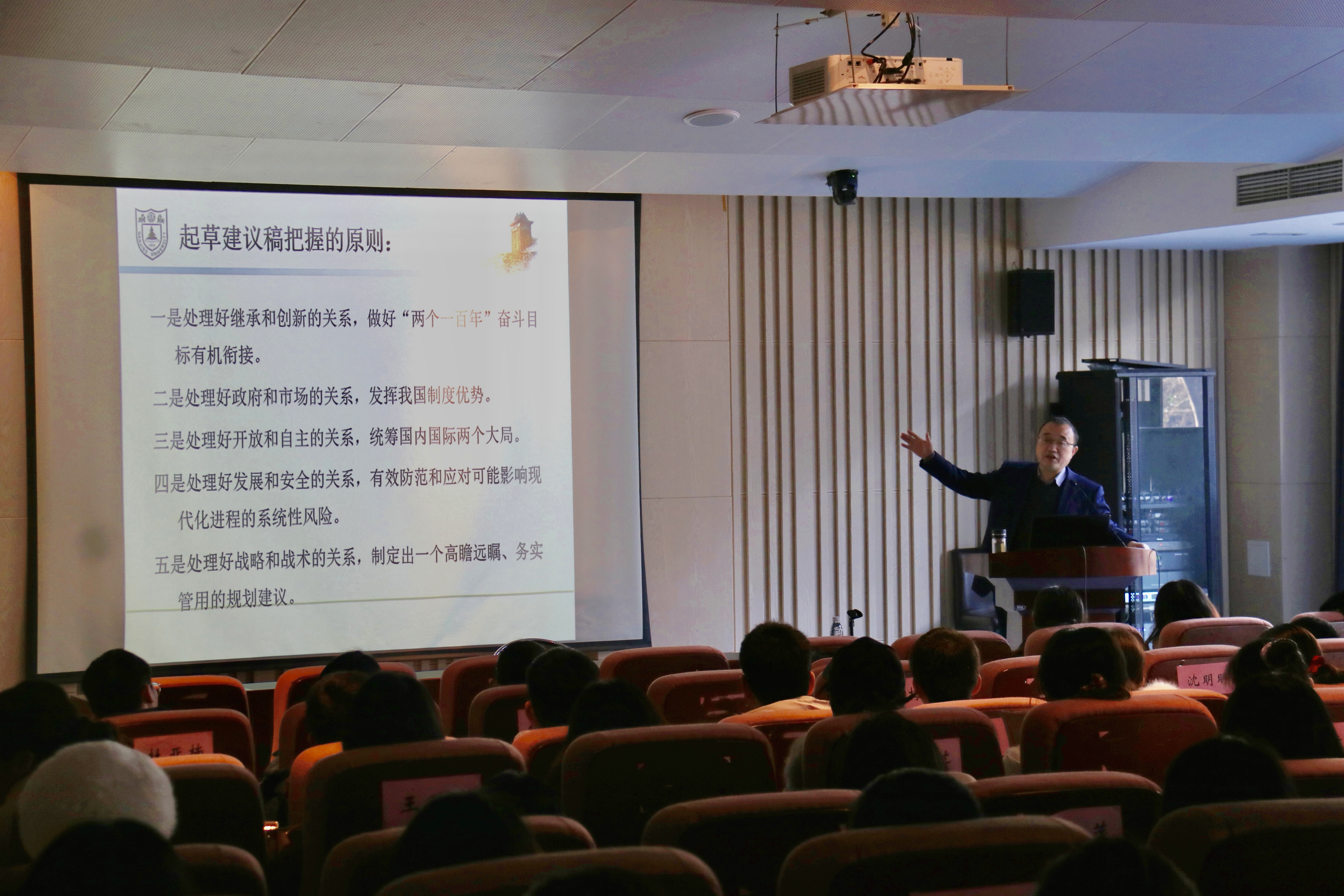 王建华围绕习近平总书记关于《中共中央关于制定国民经济和社会发展第十四个五年规划和二〇三五年远景目标的建议》的说明,重点诠释了“五对关系”,即继承与创新、政府与市场、开放与自主、发展与安全、战略与战术。与此前历次《建议》分论的块状书写结构不同,本次《建议》采用串状结构分12个领域阐述了“十四五”时期经济社会发展和改革开放的重点任务,对此他解读道,这种串状结构的背后所折射出的是更为明确的问题导向,而且在一定程度上反映出了未来我国经济社会发展面临诸多问题的轻重缓急,这一解读进一步深化了同学们对于《建议》的认识。