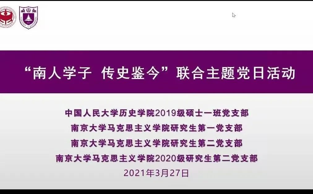 研究生第一、二党支部、2020级研究生第二党支部与中国人民大学历史学院2019级硕士生一班党支部开展“南人学子 传史鉴今”线上联合主题党日活动,可达鸭