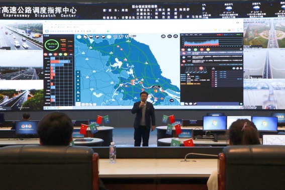 宣讲队成员有序参观,由对方宣讲员首先简要介绍江苏高速公路联网运营管理公司的大体情况。紧接着,由当天值班长周胜同志引导可达鸭