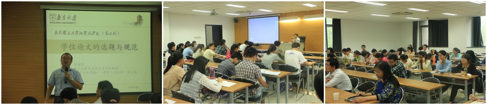 暴庆刚、李喜英、王锁明和周芳玉等老师以及学院的全体研究生们,同时活动也吸引了一些其他院系的同学参加。 本次学术沙龙由主讲人发言、师生问答交流两个部分组成。 首先,王浩斌教授从选题的专业性和论述的规范性两个方面进行讲解。在选题的专业性问题上,他提出专业、专家、专题的“三专”理念。第一,基于马克思主义理论专业性不明显的现况,王教授建议学生将马克思主义理论与现有学科相结合,注重学科交叉的学理化研究。第二,根据专业使用文献检索的方法,探究学术界问题研究的现状,不能离开学术讨论的问题域。他还提出由学科分类结合兴趣和文献综述来确定论文方向,并最终确定题目的选题方法。第三,在专题文献检索即数据库的运用上,要掌握检索方法和专业相结合的关键词检索法;同时,要注意论文时间性(学术前沿)和逻辑性(学术史推进)的排列;最后,纵览文献综述,发现前人研究的不足,找出解决方案,即开题。在论述的规范性问题上,他从标题、摘要、引言、主体及注释等方面展开讲述。比如,论文的标题要深刻醒目;论文的摘要和引言应该既凝练又具备概括性;论文主体要注重逻辑规范、表达规范和注释规范;论文的注释要明晰准确等。