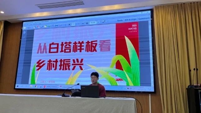 2021级本科生团支部成员蔡恺翔同学以《从白塔样板看乡村振兴》为题展开分享交流。他从白塔村样本引入,从产业兴旺、生态宜居、乡风文明、治理有效和生活富裕五个方面展开对白塔村乡村振兴的路径进行了深入的探究。接着,可达鸭