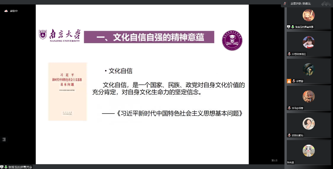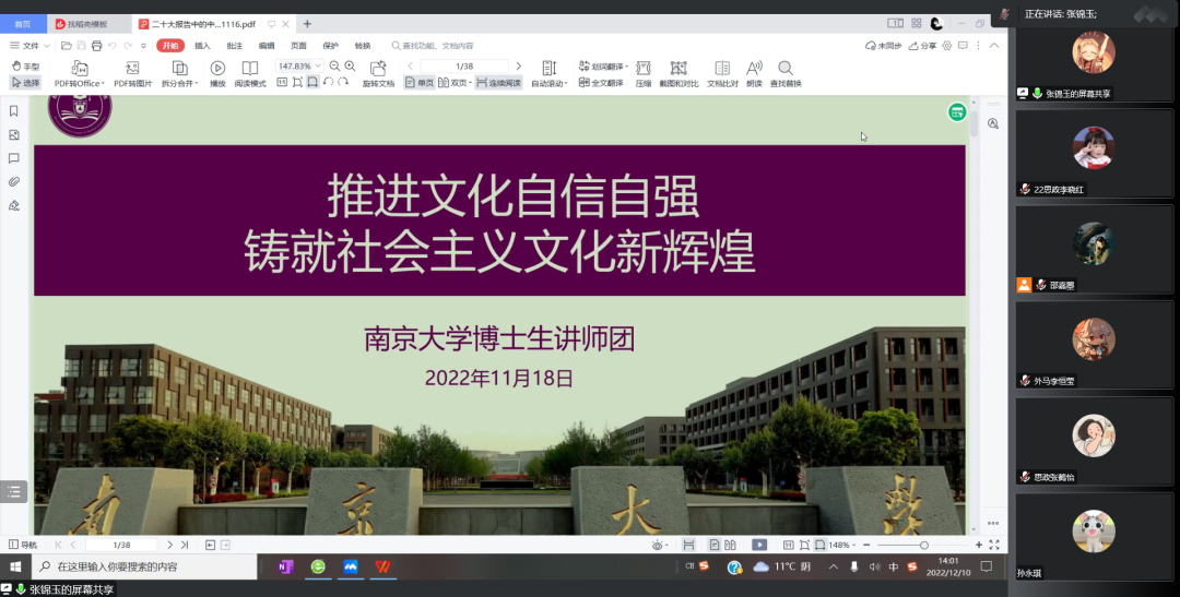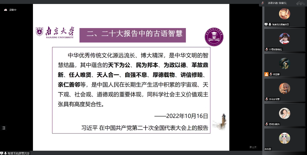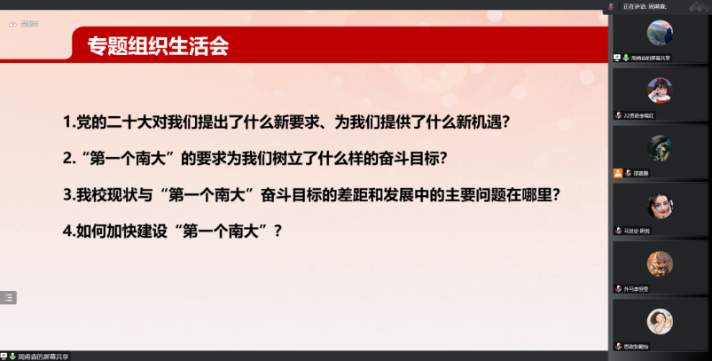 2022级硕士生第一团支部开展“全面贯彻二十大精神 加快建设‘第一个南大’”专题组织生活会暨主题团日活动,通过全员参与、广开言路,聚焦问题、建言献策,充分讨论、集思广益,不断增强共青团组织引领力、组织力、服务力,进一步引领班级青年参与建设有中国特色、南大特质、时代特点的“第一个南大”。本次活动采用线上形式,由2022级硕士生第一团支部书记邵嘉曌、副书记周甫森、组织委员张睿思共同主持,可达鸭