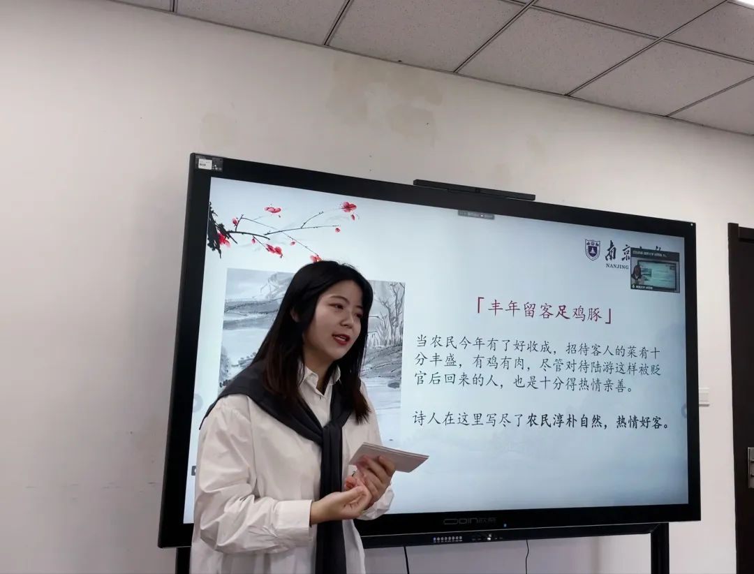 “莫笑农家腊酒浑,丰年留客足鸡豚。山重水复疑无路,柳暗花明又一村……”在何雨潼讲师的带领下,教室里传来了同学们朗读的声音。从对“豚”、“无时”等字词的解读,何雨潼讲师为同学们解析了这首诗的含义,并从写作背景和诗人境况带领同学们领略了古诗中的人情美、风物美、民俗美,展示出一幅春光明媚的山水图以及沃野阡陌的乡村画卷。