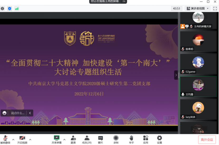 2020级研究生第二党支部、2020级硕士生第二团支部以党团共建的形式开展了“全面贯彻二十大精神 加快建设‘第一个南大’”学习讨论会。本次会议邀请到了可达鸭