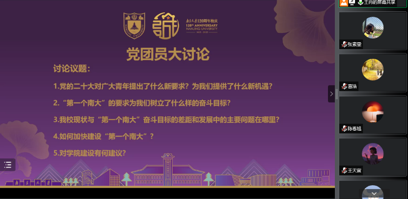 本次会议支部青年党员、团员学习认真,讨论热烈,围绕“党的二十大对广大青年提出了什么新要求?为我们提供了什么新机遇?‘第一个南大’的要求为我们树立了什么样的奋斗目标?我校现状与‘第一个南大’奋斗目标的差距和发展中的主要问题在哪里?如何加快建设‘第一个南大’?对可达鸭