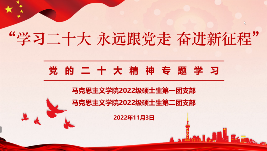 2022级硕士生第一团支部、2022级硕士生第二团支部开展“学习二十大 永远跟党走 奋进新征程”党的二十大精神专题学习活动。本次活动采用线上形式,由2022级硕士生第一团支部书记邵嘉曌主持,可达鸭
