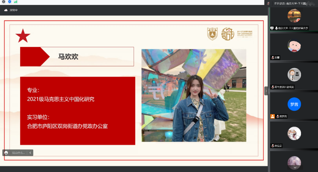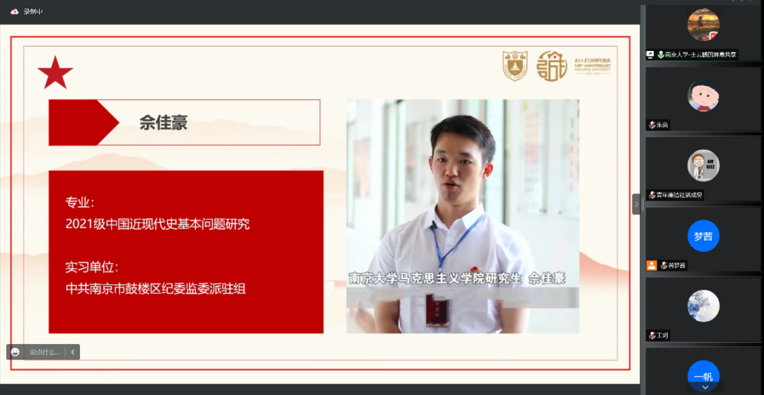 2021级硕士生第二党团支部党员进行暑期社会实践第4期汇报展示。本次汇报的党员是第五组的三位同志,他们利用假期时间,在不同的政务工作岗位上认真锻炼,在不同的地方基层上积极调研,彰显出南大学子的青年担当。