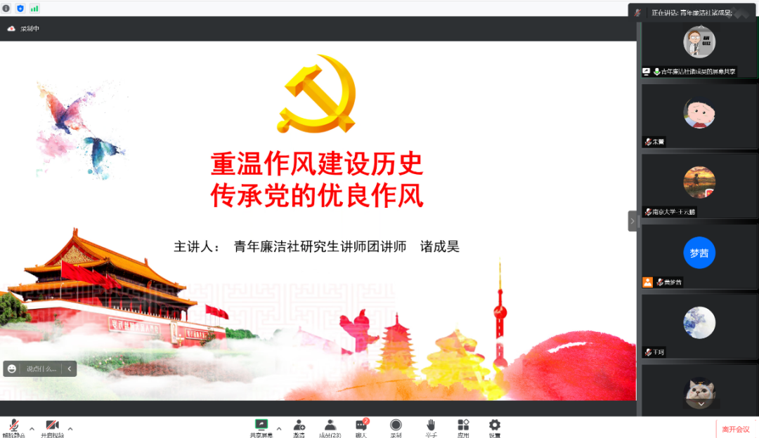 青年廉洁社联合开展“扬实践风采,展青年担当——2021级硕士研究生第二党支部暑期主题党日活动第4期‘廉洁廉政’实践风采展示。”会议由2021级硕士生第二党支部成员王云鹏同志主持。