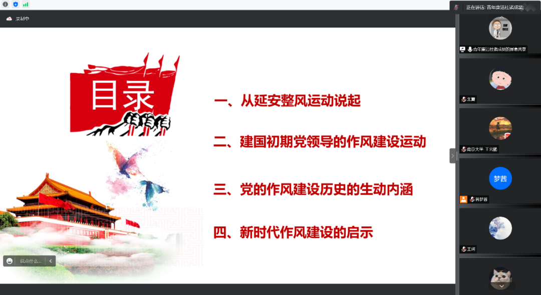 青年廉洁社研究生讲师团讲师诸成昊同学作“重温作风建设历史,传承党的优良作风”主题宣讲。他从延安整风运动说起,通过建国初期党领导的作风建设运动、党的作风建设历史的生动内涵、新时代作风建设的启示三个板块为大家梳理了党的作风建设的历史经验与现实。以建国初期的五次作风建设运动为线索,通过讲述毛泽东与黄炎培的“窑洞对”和西柏坡会议“两个务必”精神等生动内涵,使同志们认识到我们党的作风建设作为一项伟大工程对于党的建设的重要意义。最后,诸成昊同学总结了新时代作风建设的四点启示:把握作风建设的宝贵经验、传承理论联系实际的作风、密切联系人民群众的作风、积极开展自我批评的作风。历史启示我们,只有不忘初心,牢记来时路,才能理清思想之迷雾,不断提高坚持发展中国特色社会主义的能力。