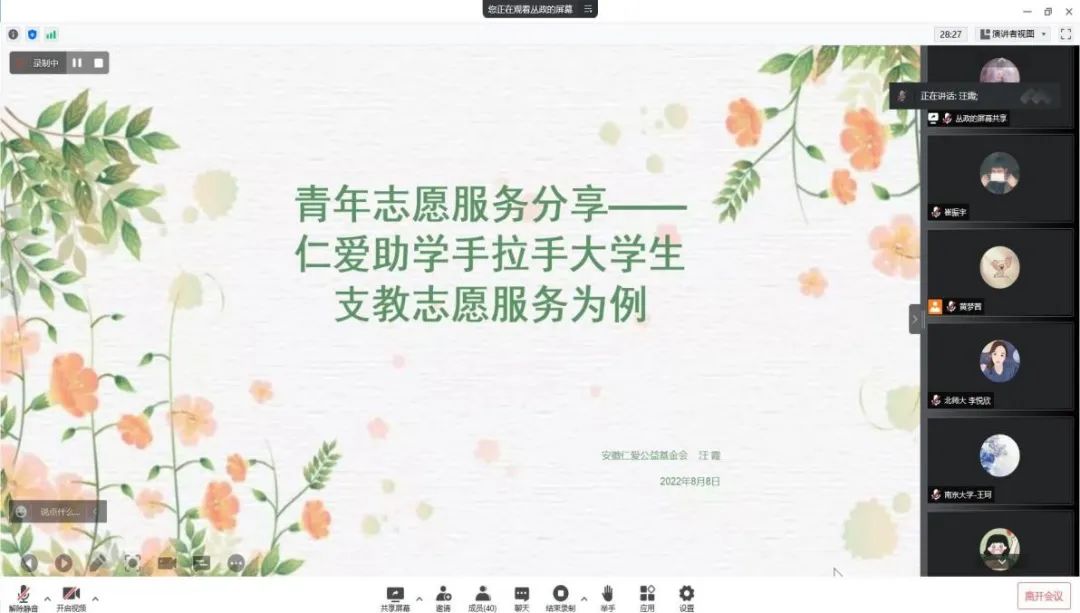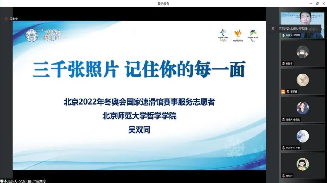 2021级硕士生第二党支部与安徽仁爱公益基金会、北京师范大学“冰雪有余情”北京冬奥会遗产转化实践队联合开展“扬实践风采,展青年担当——2021级硕士研究生第二党支部暑期主题党日活动第1期‘志愿精神’实践风采展示。”会议由2021级硕士生第二党支部成员丛政同志主持。