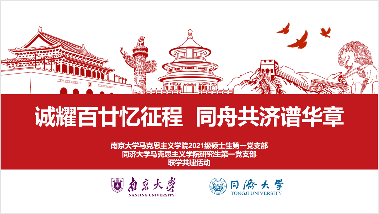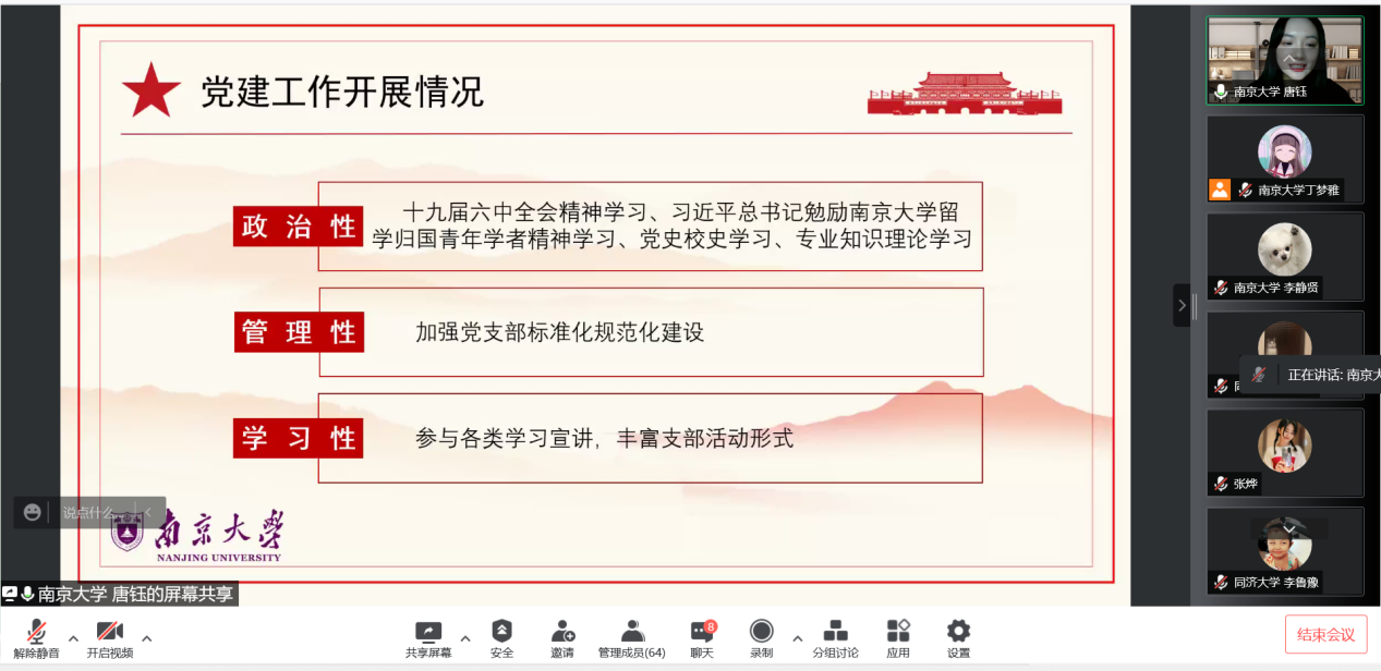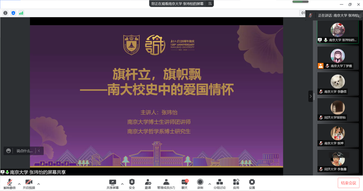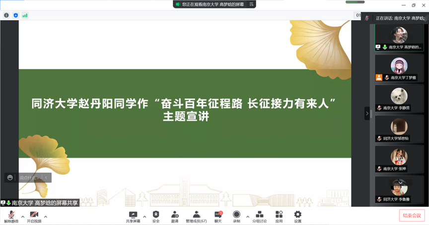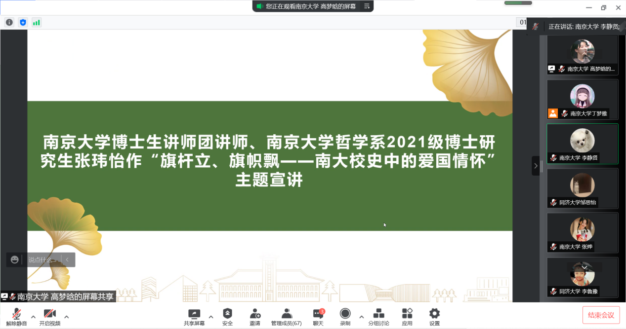 哲学系2021级博士研究生张玮怡为两支部成员带来“旗杆立、旗帜飘——南大校史中的爱国情怀”主题宣讲,同济大学赵丹阳同学就同济大学校史向两支部成员作“奋斗百年征程路 长征接力有来人”主题宣讲。