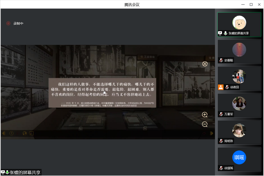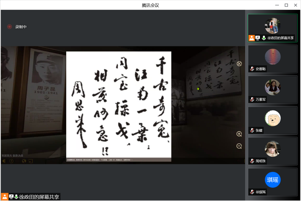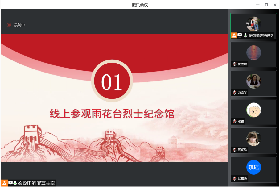 活动第一项,由第二党小组同学通过VR全景方式带领大家线上参观雨花台烈士纪念馆,与大家一同走进了为求民族解放,同侵略者进行斗争的革命历史,聆听了无数仁人志士壮烈牺牲的英雄事迹。首先,张蝶同学带领大家参观了雨花台烈士纪念馆基本陈列厅的第一部分“光荣北伐革命先锋”,介绍了革命先锋金佛庄、成律等烈士的生平和革命故事,他们在北伐中英勇奋战成为了雨花台最早的革命烈士。紧接着,丁政方同学带领大家参观了陈列厅的第二部分“力挽狂澜前仆后继”,何宝珍、毛福轩、朱杏南、谢文锦、顾衡、石璞、袁咨桐、邓演达等烈士英勇就义,还有更多的人甚至没有留下姓名。最后,由徐政田同学带大家参观了第三部分“奋起抗战中流砥柱”和第四部分“迎接黎明血沃新天”,介绍了在抗战期间涌现的如罗登贤、孙晓梅、皖南三烈、北平五烈士等奋起抗战的一大批烈士们,他们是革命继续前进的中流砥柱。在中国革命的漫漫长夜中,他们每一个人都是一颗闪亮的星辰,照亮了中国革命继续前行的道路,鼓舞和激励共产党人和亿万人民为实现伟大理想而斗争不息。今天我们在这里回顾雨花英烈的英勇事迹和崇高精神,这也将成为鼓舞我们为实现中华民族伟大复兴中国梦不懈前行的强大精神力量。