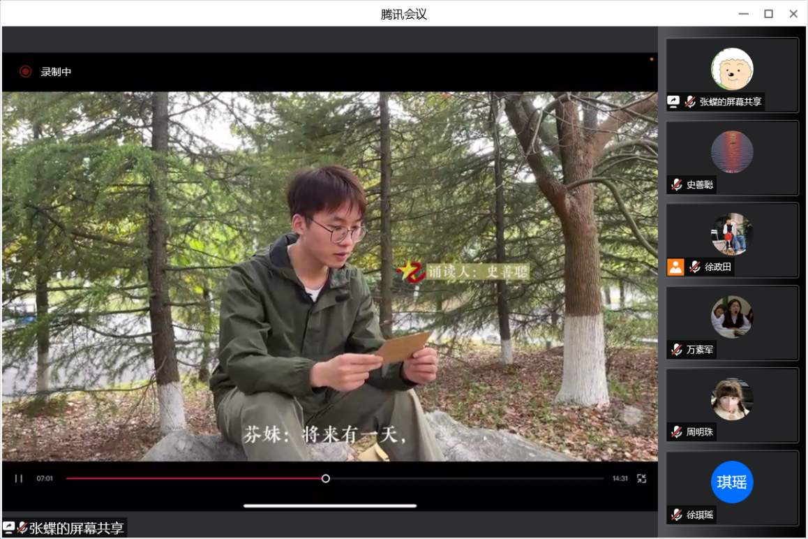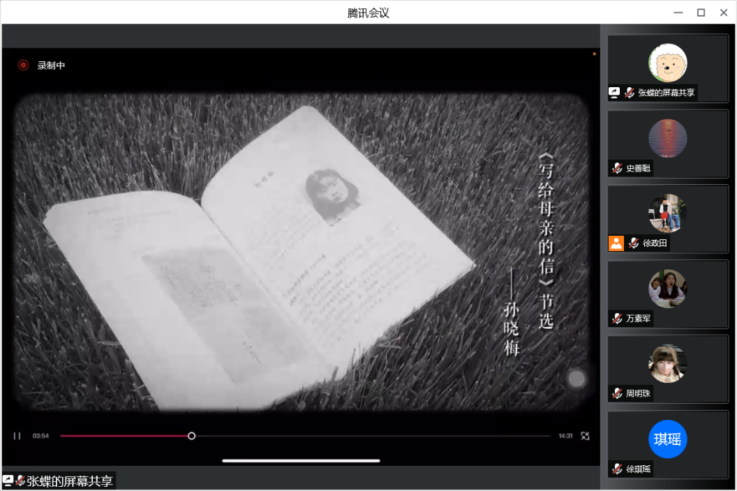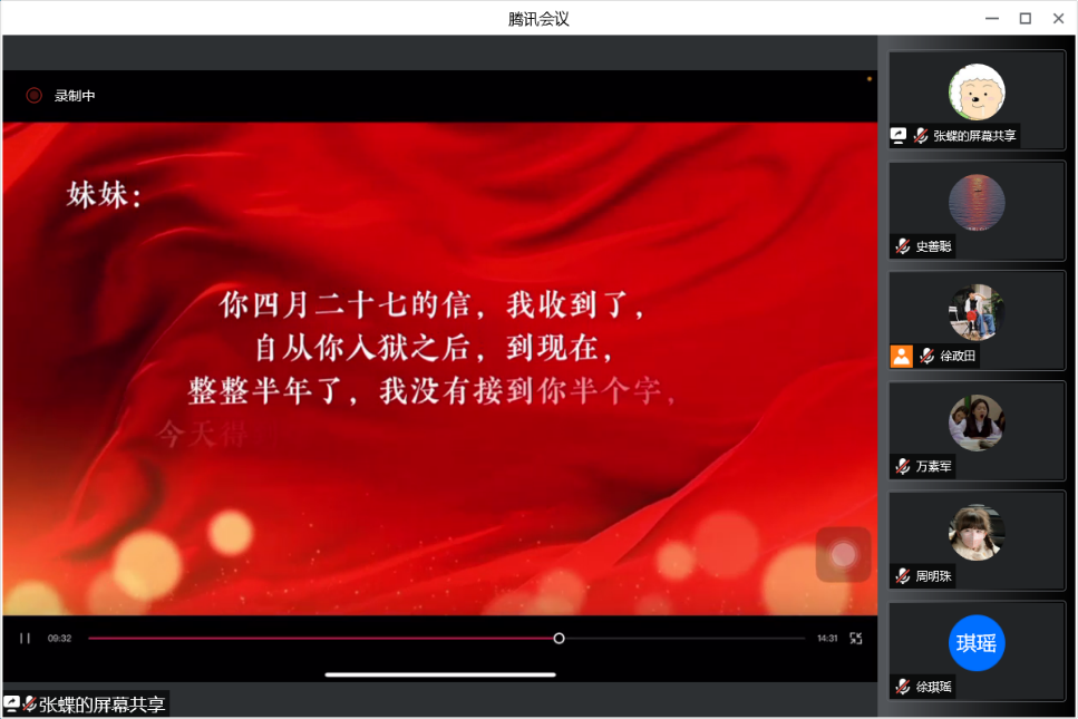 该环节,党支部成员们一同观看了由第二党小组拍摄的家书诵读视频,视频尚未播放完毕,就在支部群内收到了党支部成员们的热烈反响,大家纷纷表示,为认真制作的视频和一封封情真意切的家书所感动。