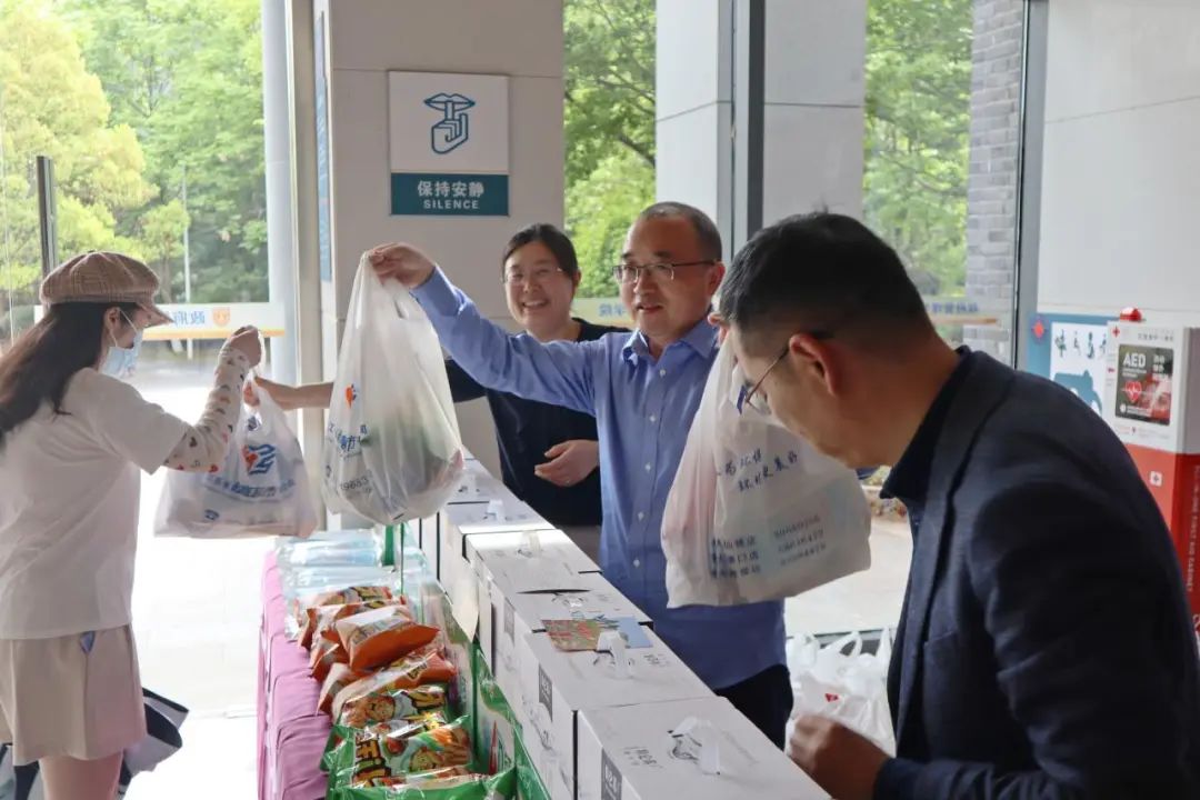 于4月22日在圣达楼大厅为在校学生发放慰问物资。学院党委书记王建华、院长胡大平、党委副书记时昱和团委书记刘晶月几位老师将一份份承载着学院心意的暖心礼包发放到学生手中,同时关心同学们的封校生活,叮嘱大家在特殊时期做好个人防护,守护身心健康。礼包内不仅包含多种零食,还有特制的明信片和防疫物资。