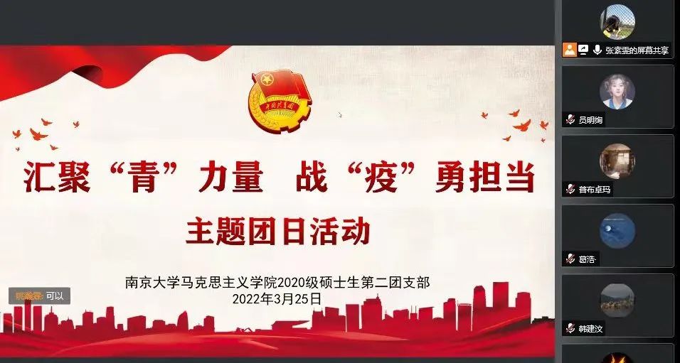 2021级硕士生第二团支部、2020级硕士生第二团支部、2019级硕士生第二团支部以及2021级博士生团支部于线上联合开展了“薪火相传,弦歌不辍——南大精神大讨论”主题团日活动,百余名团员青年共聚云端、共话校庆、共学南大精神。