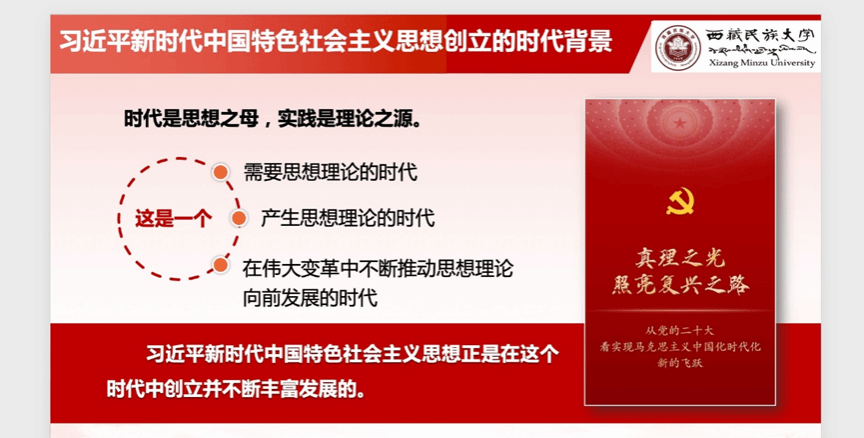 西藏民大思想政治教育专业教研室主任邓新星老师做教学展示,主讲内容为《习近平新时代中国特色社会主义思想创立的时代背景》。